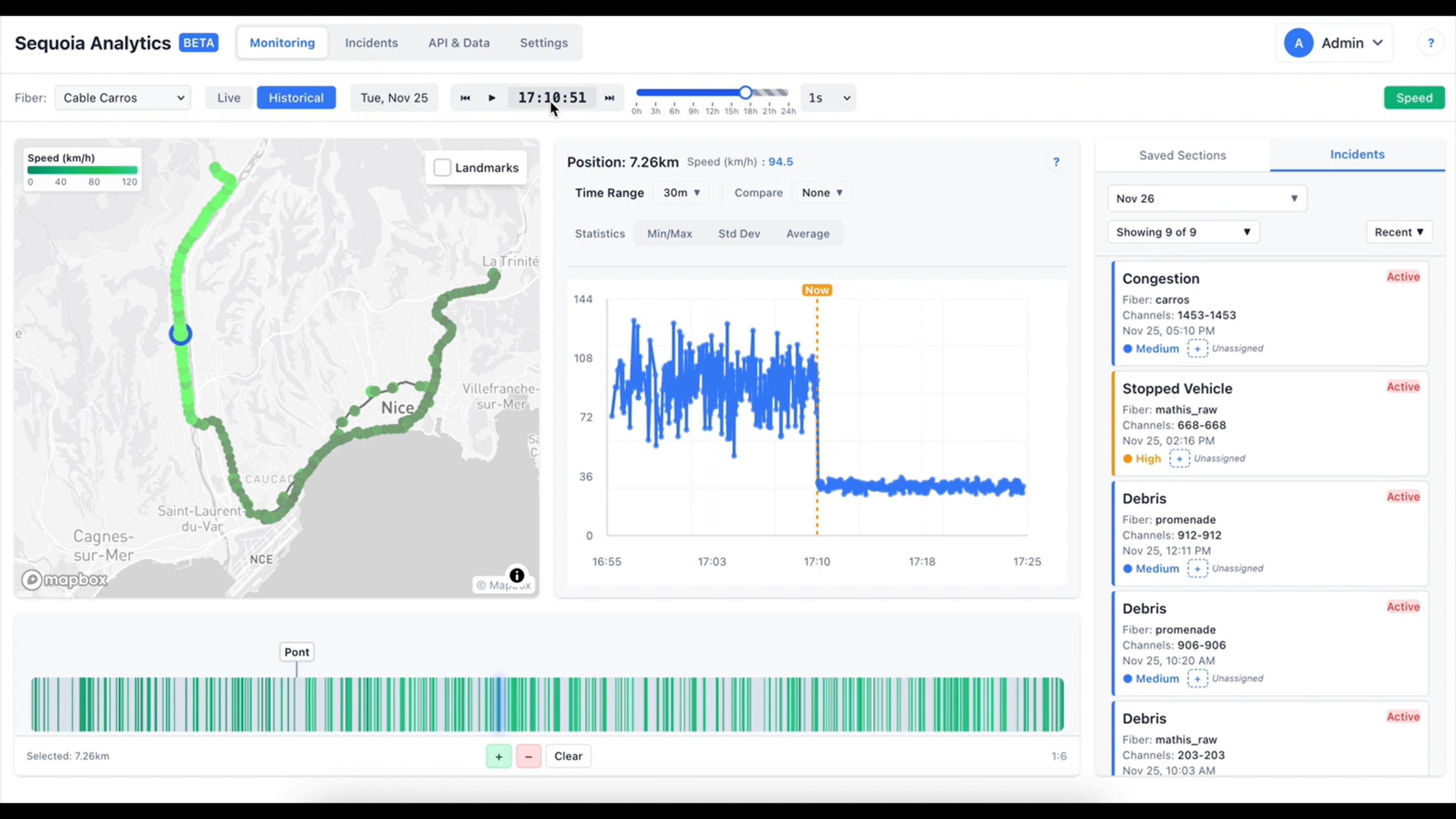 TrafficSense is our solution for long-range road traffic monitoring. We convert already available fibre-optic networks into arrays of virtual sensors with metric resolution (+/- 5 metres), operating continuously and in real time (+ 30 seconds).